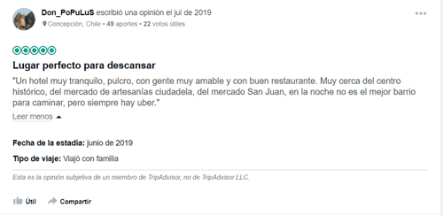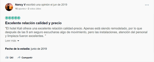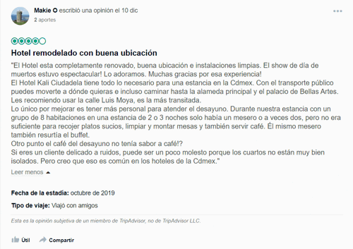 En Kali Hoteles sabemos que TripAdvisor se ha convertido en una fuente confiable para investigar cómo es la experiencia en algunos hoteles. Por ello, queremos compartirte los últimos comentarios que viajeros como tú han hecho sobre Kali Escandón y Kali Ciudadela. En este sentido, te dejaremos unas capturas de pantalla de los comentarios más recientes que se han hecho en la red social del búho viajero.